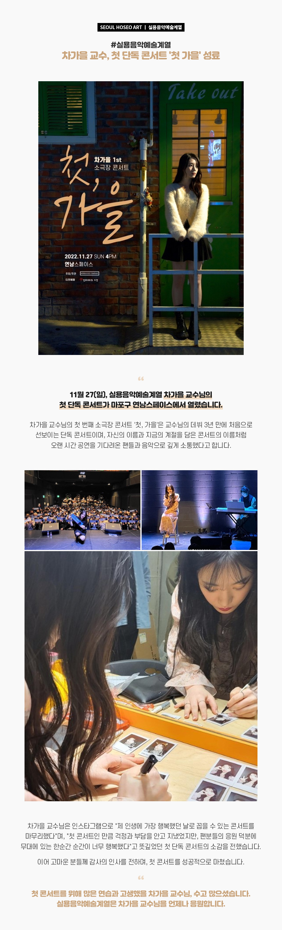 11월 27(일), 실용음악예술계열 차가을 교수님의 첫 단독 콘서트가 마포구 연남스페이스에서 열렸습니다. 차가을 교수님의 첫 번째 소극장 콘서트 '첫, 가을'은 교수님의 데뷔 3년 만에 처음으로 선보이는 단독 콘서트이며, 자신의 이름과 지금의 계절을 담은 콘서트의 이름처럼 오랜 시간 공연을 기다려온 팬들과 음악으로 깊게 소통했다고 합니다.