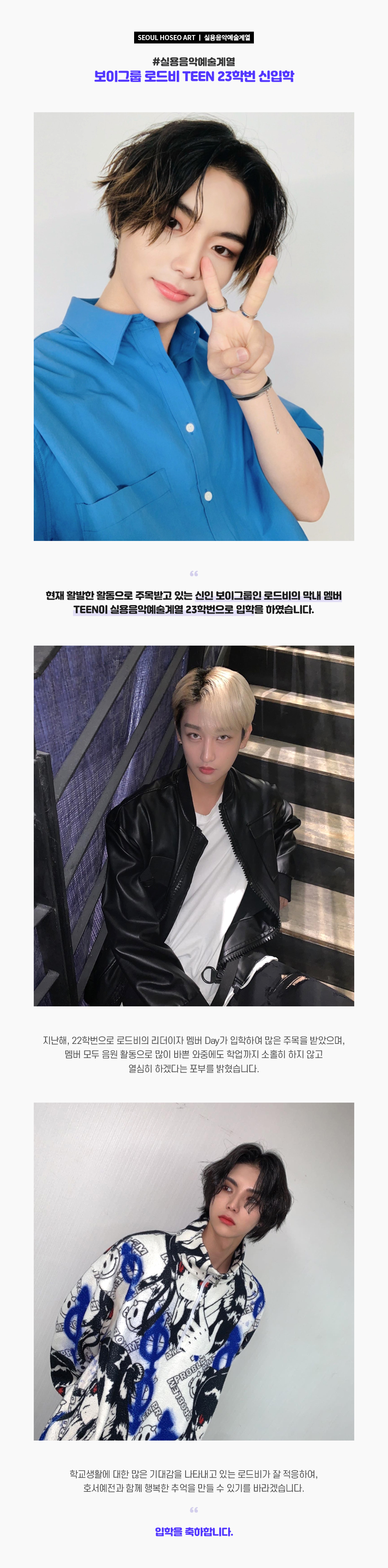현재 활발한 활동으로 주목받고 있는 신인 보이그룹인 로드비의 막내 멤버 TEEN이 실용음악예술계열 23학번으로 입학을 하였습니다. 지난해, 22학번으로 로드비의 리더이자 멤버 Day가 입학하여 많은 주목을 받았으며, 멤버 모두 음원 활동으로 많이 바쁜 와중에도 학업까지 소홀히 하지 않고 열심히 하겠다는 포부를 밝혔습니다.