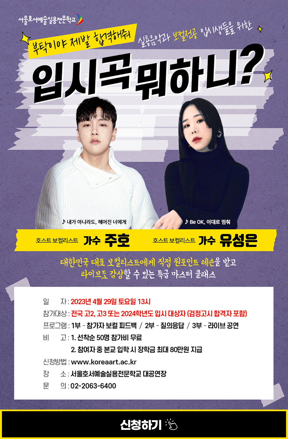 서울호서예술실용전문학교 실용음악예술계열 가수 주호, 유성은과 함께 직접 원포인트 레슨을 받고 라이브도 감상할 수 있는 실용음악과 보컬전공 입시생들을 위한 2023 입시곡 뭐하니? 신청하기