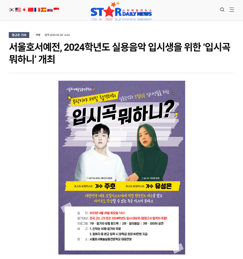 실용음악 보컬 입시생을 위한 ‘입시곡 뭐하니?’는 4월 29일 토요일 오후 1시 행사를 주최하는 서울호서예전 예술관에서 진행되며 선착순 50명, 참가비 무료로 진행된다. 신청은 행사를 진행하는 서울호서예전 홈페이지에서 가능하다.