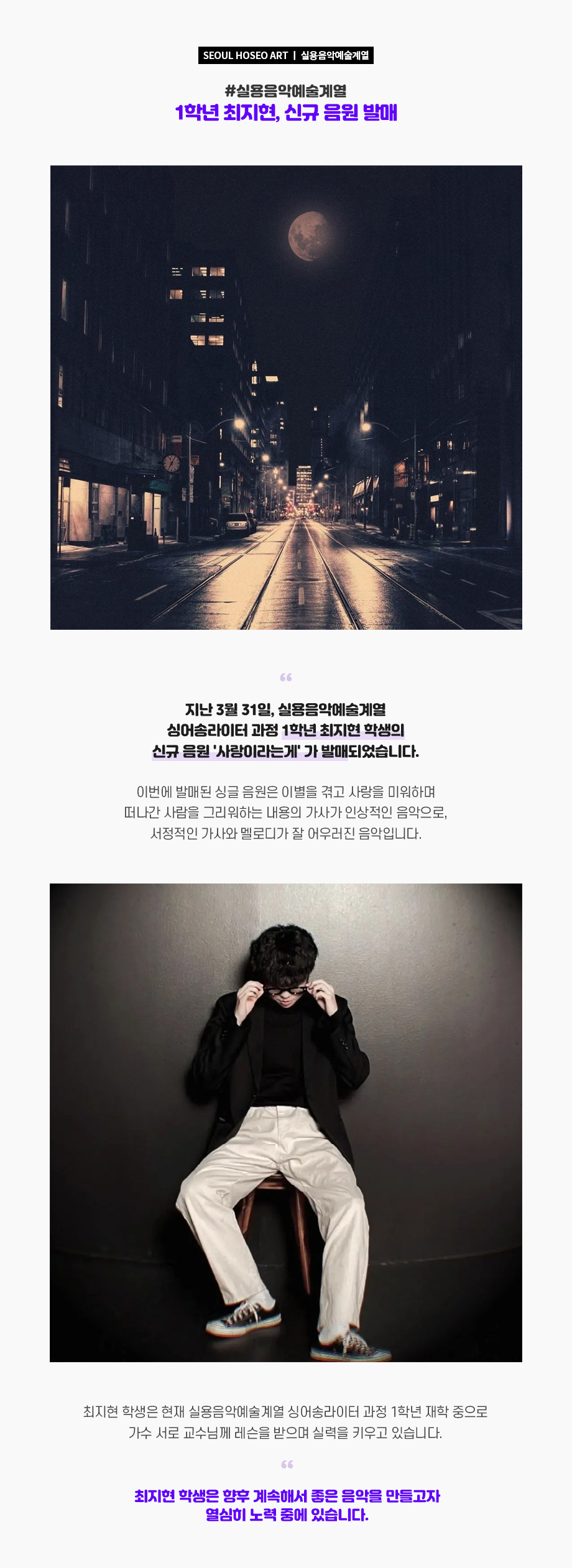 지난 3월 31일, 실용음악예술계열 싱어송라이터 과정 1학년 최지현 학생의 신규 음원 '사랑이라는게' 가 발매되었습니다. 이번에 발매된 싱글 음원은 이별을 겪고 사랑을 미워하며 떠나간 사람을 그리워하는 내용의 가사가 인상적인 음악으로, 서정적인 가사와 멜로디가 잘 어우러진 음악입니다.