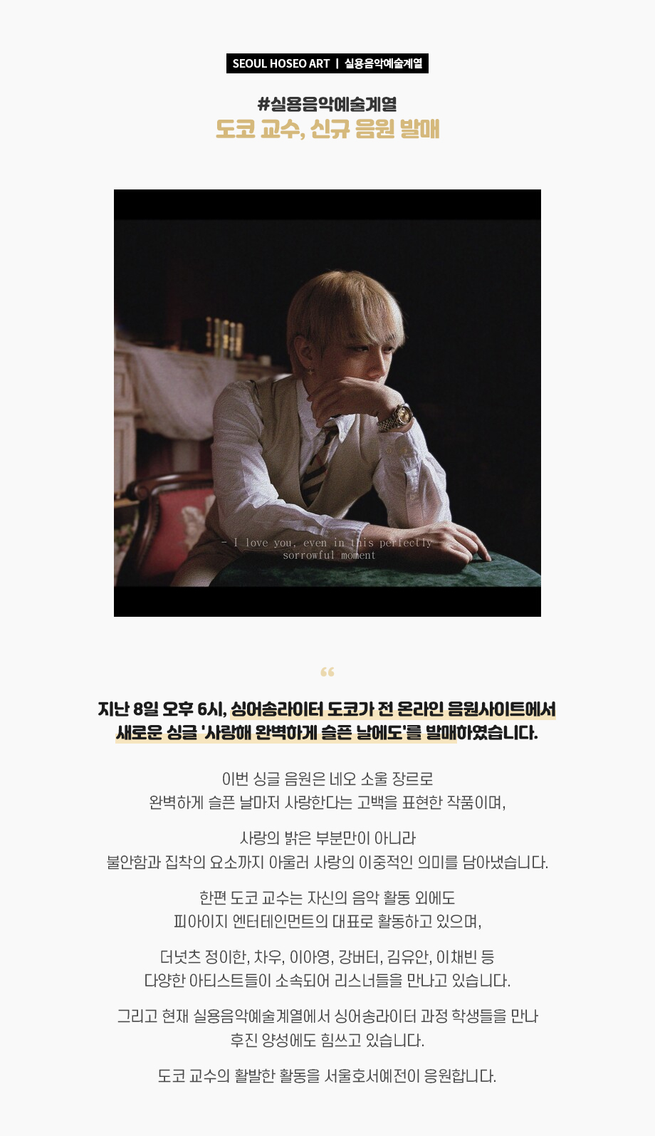 지난 8일 오후 6시, 싱어송라이터 도코가 전 온라인 음원사이트에서 새로운 싱글 '사랑해 완벽하게 슬픈 날에도'를 발매?하였습니다. 이번 싱글 음원은 네오 소울 장르로 완벽하게 슬픈 날마저 사랑한다는 고백을 표현한 작품이며, 사랑의 밝은 부분만이 아니라 불안함과 집착의 요소까지 아울러 사랑의 이중적인 의미를 담아냈습니다. 한편 도코 교수는 자신의 음악 활동 외에도 피아이지 엔터테인먼트의 대표로 활동하고 있으며, 더넛츠 정이한, 차우, 이아영, 강버터, 김유안, 이채빈 등 다양한 아티스트들이 소속되어 리스너들을 만나고 있습니다.