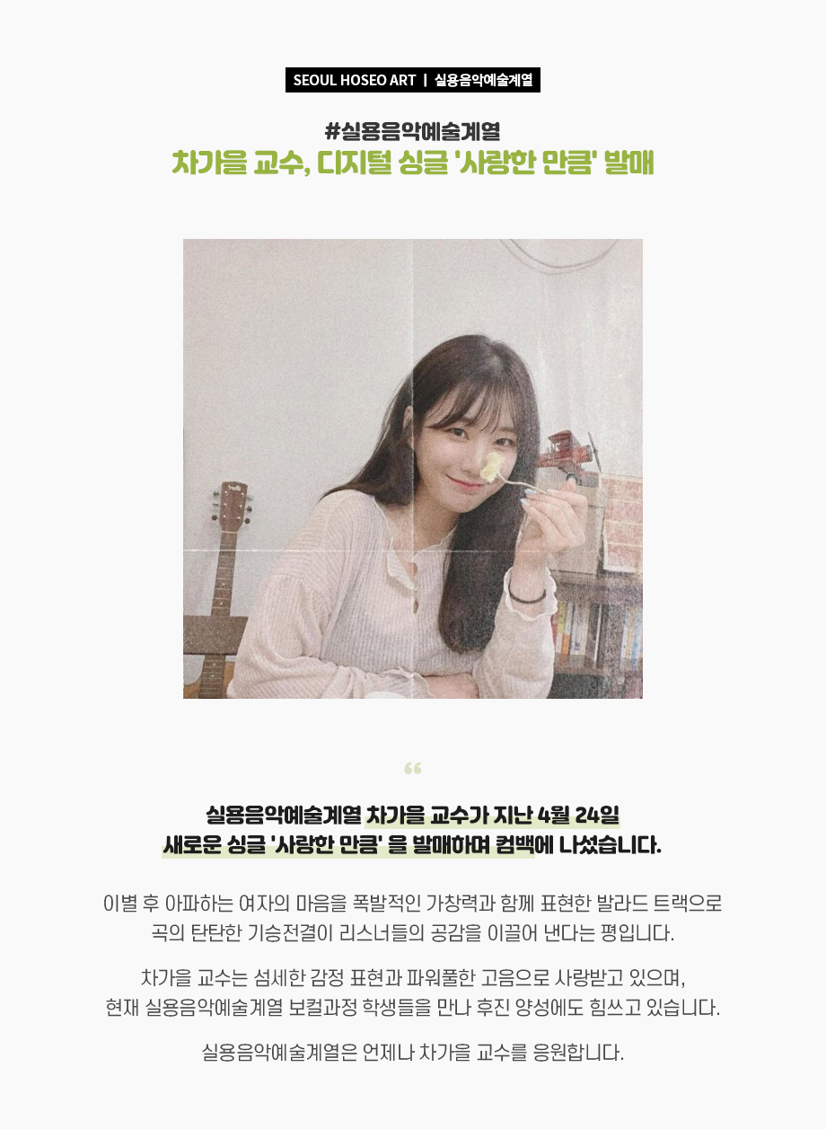 실용음악예술계열 차가을 교수가 지난 4월 24일 새로운 싱글 '사랑한 만큼' 을 발매하며 컴백에 나섰습니다. 이별 후 아파하는 여자의 마음을 폭발적인 가창력과 함께 표현한 발라드 트랙으로 곡의 탄탄한 기승전결이 리스너들의 공감을 이끌어 낸다는 평입니다.