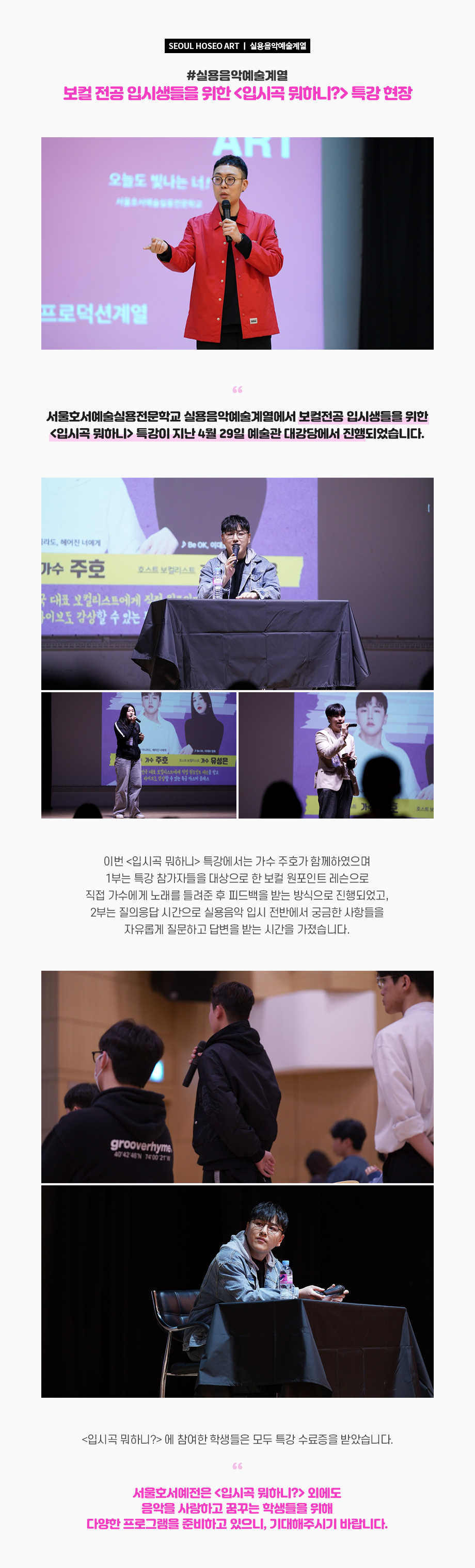서울호서예술실용전문학교 실용음악예술계열에서 보컬전공 입시생들을 위한 <입시곡 뭐하니> 특강이 지난 4월 29일 예술관 대강당에서 진행되었습니다. 이번 <입시곡 뭐하니> 특강에서는 가수 주호가 함께하였으며 1부는 특강 참가자들을 대상으로 한 보컬 원포인트 레슨으로 직접 가수에게 노래를 들려준 후 피드백을 받는 방식으로 진행되었고, 2부는 질의응답 시간으로 실용음악 입시 전반에서 궁금한 사항들을 자유롭게 질문하고 답변을 받는 시간을 가졌습니다.
