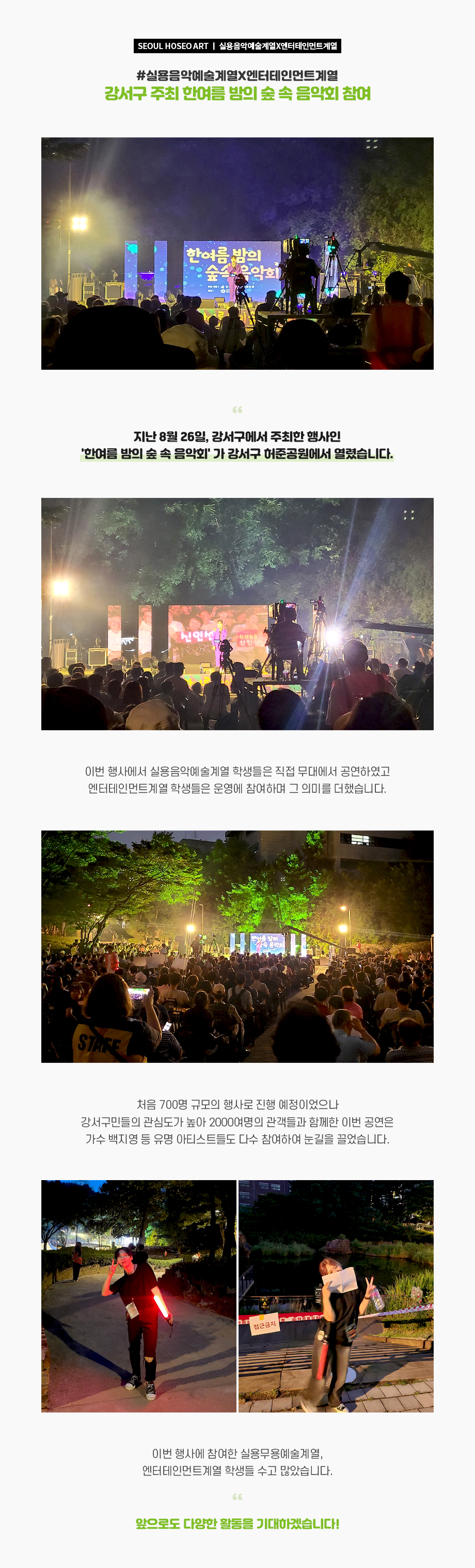 지난 8월 26일, 강서구에서 주최한 행사인 '한여름 밤의 숲 속 음악회' 가 강서구 허준공원에서 열렸습니다. 이번 행사에서 실용음악예술계열 학생들은 직접 무대에서 공연하였고 엔터테인먼트계열 학생들은 운영에 참여하며 그 의미를 더했습니다.