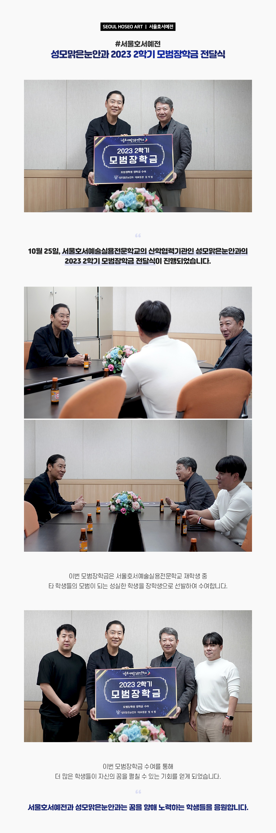 10월 25일, 서울호서예술실용전문학교의 산학협력기관인 성모맑은눈안과의 2023 2학기 모범장학금 전달식이 진행되었습니다. 이번 모범장학금은 서울호서예술실용전문학교 재학생 중 타 학생들의 모범이 되는 성실한 학생을 장학생으로 선발하여 수여합니다.
