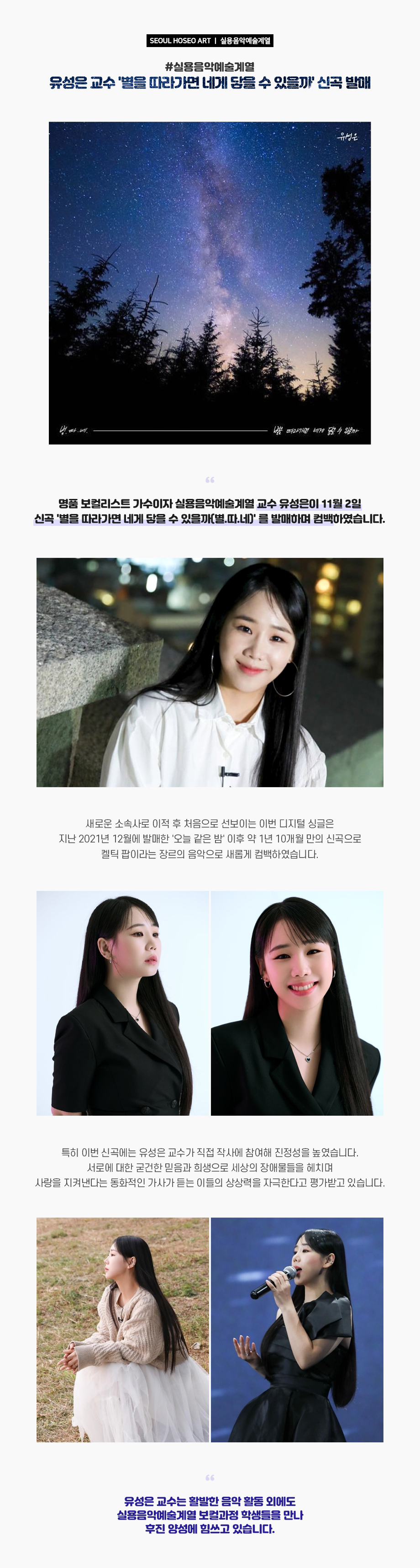 명품 보컬리스트 가수이자 실용음악예술계열 교수 유성은?이 11월 2일 신곡 '별을 따라가면 네게 닿을 수 있을까(별.따.네)' 를 발매하며 컴백하였습니다. 새로운 소속사로 이적 후 처음으로 선보이는 이번 디지털 싱글은 지난 2021년 12월에 발매한 '오늘 같은 밤' 이후 약 1년 10개월 만의 신곡으로 켈틱 팝이라는 장르의 음악으로 새롭게 컴백하였습니다.