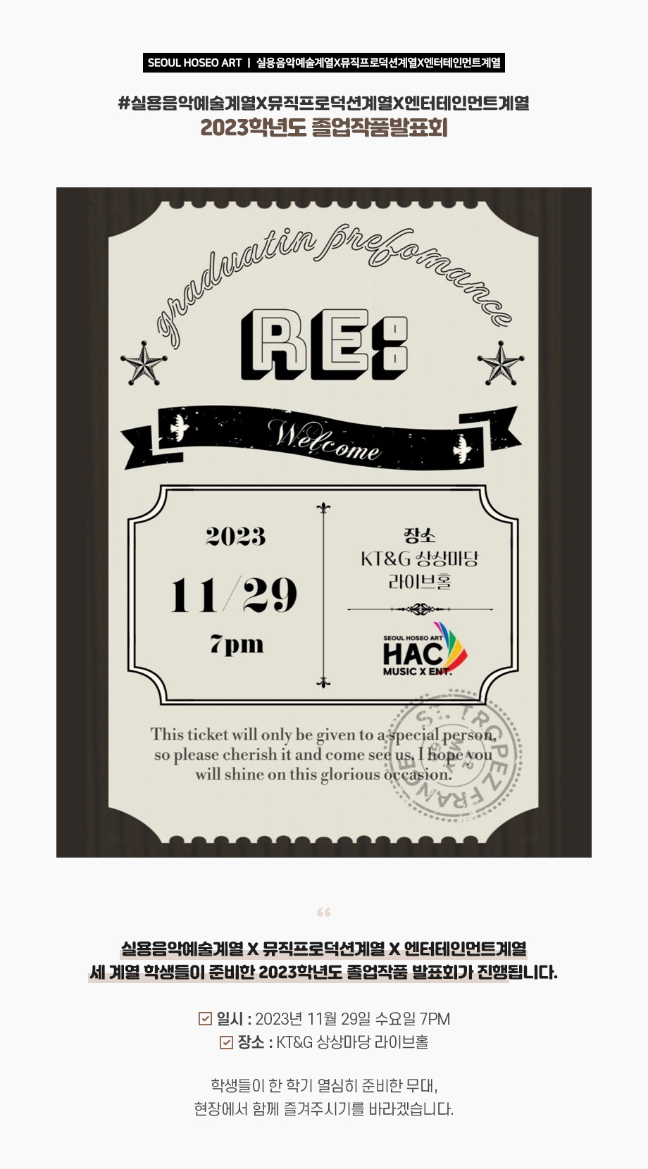 실용음악예술계열 X 뮤직프로덕션계열 X 엔터테인먼트계열 세 계열 학생들이 준비한 2023학년도 졸업작품 발표회가 진행됩니다. ?일시: 2023년 11월 29일 수요일 7PM ?장소: KT&G 상상마당 라이브홀 학생들이 한 학기 열심히 준비한 무대, 현장에서 함께 즐겨주시기를 바라겠습니다.