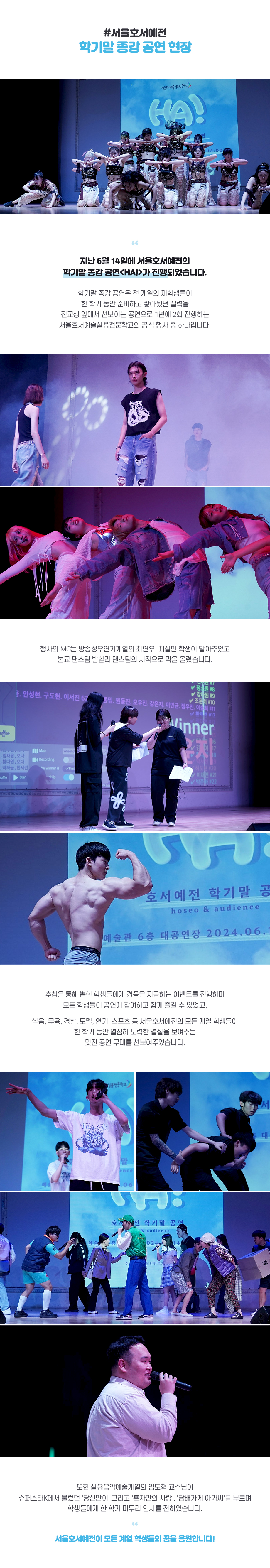 가 진행되었습니다. 학기말 종강 공연은 전 계열의 재학생들이 한 학기 동안 준비하고 쌓아뒀던 실력을 전교생 앞에서 선보이는 공연으로 1년에 2회 진행하는 서울호서예술실용전문학교의 공식 행사 중 하나입니다.