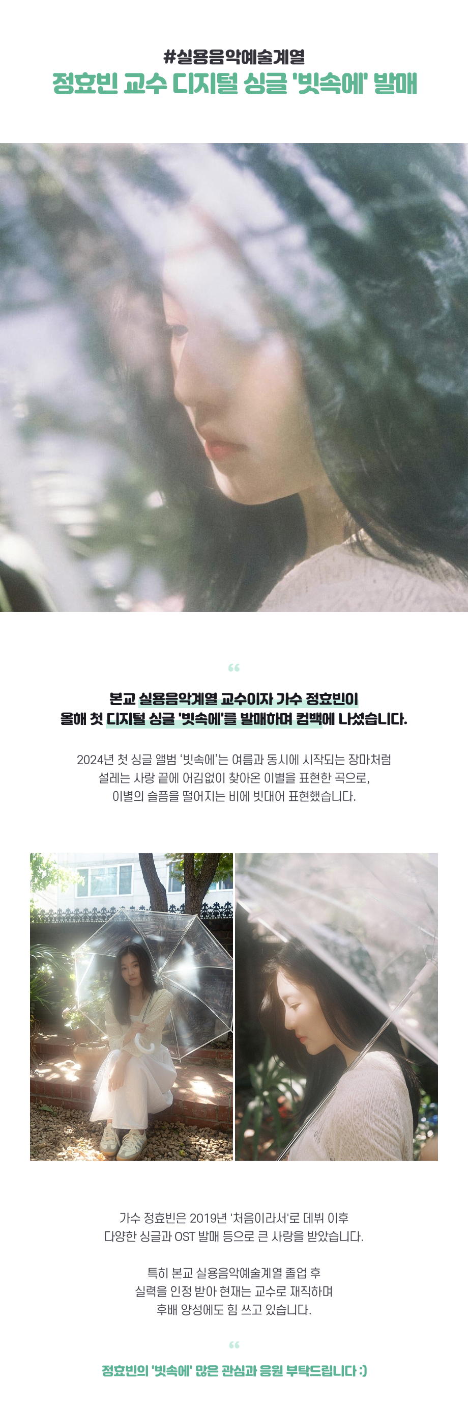 가수 정효빈이 올해 첫 디지털 싱글 '빗속에'를 발매하며 컴백에 나섰습니다. 2024년 여름 장마철과 어울리는 이번 싱글에서 정효빈 교수의 감성적인 가창력이 돋보이는 곡 입니다. 가수 정효빈은 2019년 '처음이라서'로 데뷔 이후 다양한 싱글과 OST 발매 등으로 큰 사랑을 받았습니다. 특히 본교 실용음악예술계열 졸업 후 실력을 인정 받아 현재는 교수로 재직하며 후배 양성에도 힘 쓰고 있습니다.