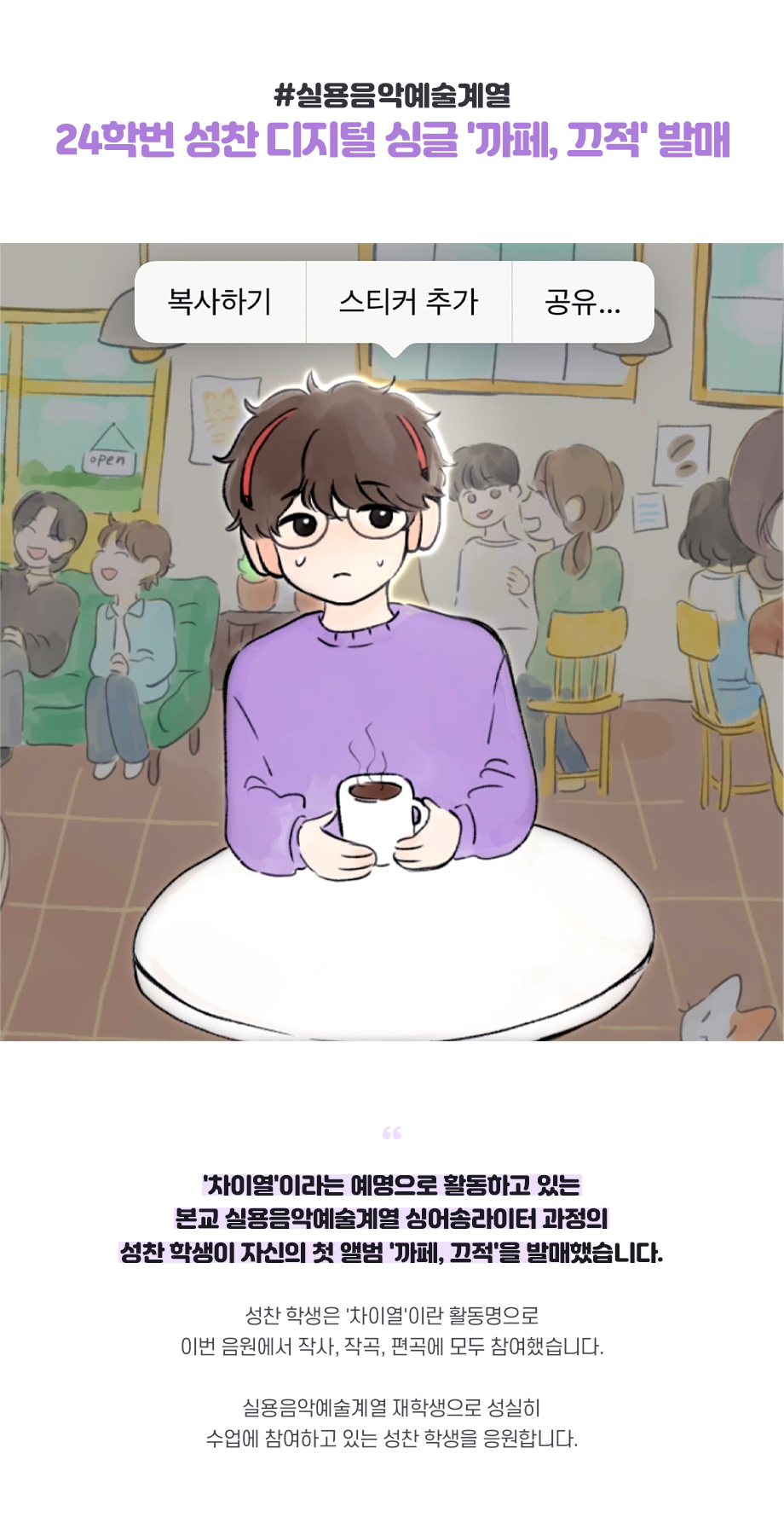 '차이열'이라는 예명으로 활동하고 있는 서울호서예술실용전문학교 실용음악예술계열 싱어송라이터 과정의 성찬 학생이 자신의 첫 앨범 '까페, 끄적'을 발매했습니다. 성찬 학생은 '차이열'이란 활동명으로 이번 음원에서 작사, 작곡, 편곡에 모두 참여했습니다. 실용음악예술계열 재학생으로 성실히 수업에 참여하고 있는 성찬 학생을 응원합니다.