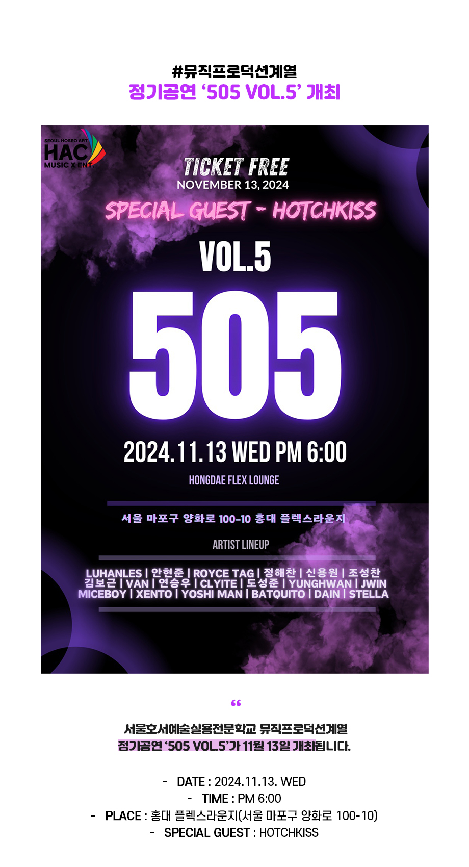 뮤직프로덕션계열 정기공연 '505 VOL.5' 개최