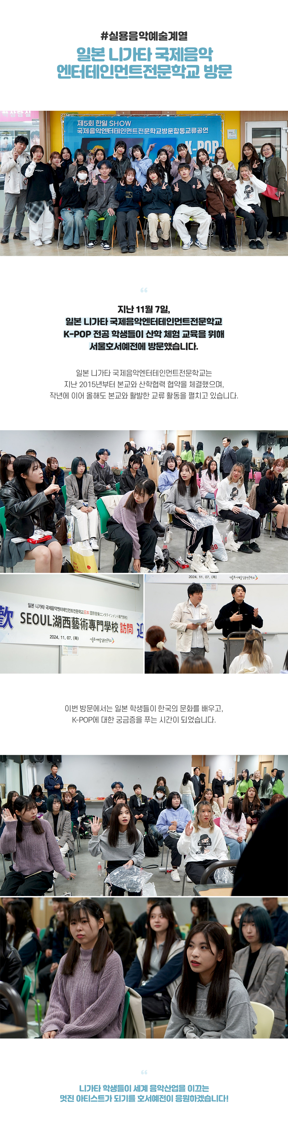 지난 11월 7일, 일본 니가타 국제음악엔터테인먼트전문학교 K-POP 전공 학생들이 산학 체험 교육을 위해 서울호서예술실용전문학교에 방문했습니다. 일본 니가타 국제음악엔터테인먼트전문학교는 지난 2015년부터 본교와 산학협력 협약을 체결했으며, 작년에 이어 올해도 본교와 활발한 교류 활동을 펼치고 있습니다.
