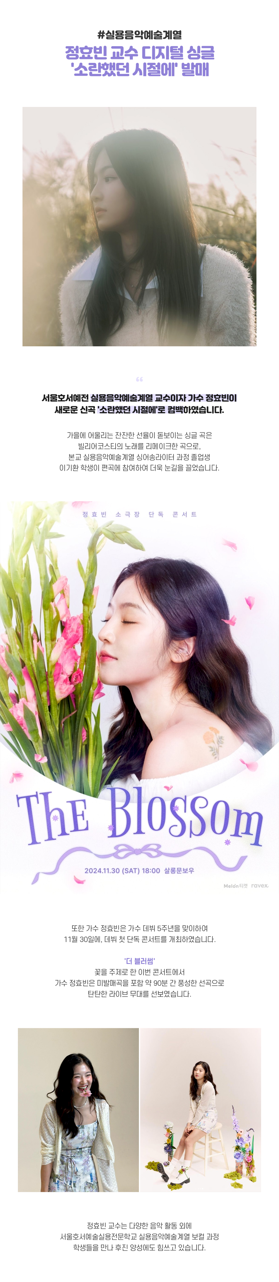 서울호서예전 실용음악예술계열 교수이자 가수 정효빈이 새로운 신곡 '소란했던 시절에'로 컴백하였습니다. 가을에 어울리는 잔잔한 선율이 돋보이는 싱글 곡은 빌리어코스티의 노래를 리메이크한 곡으로, 본교 실용음악예술계열 싱어송라이터 과정 졸업생 이기환 학생이 편곡에 참여하여 더욱 눈길을 끌었습니다.