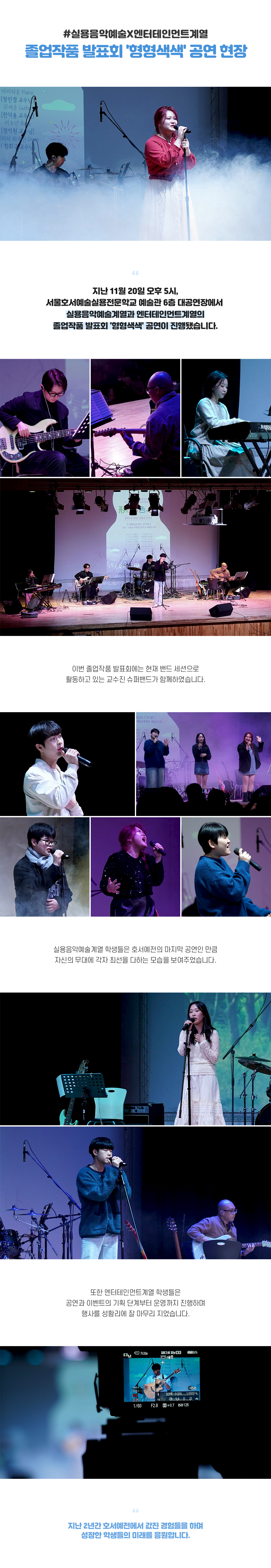 지난 11월 20일 오후 5시, 서울호서예술실용전문학교 예술관 6층 대공연장에서 실용음악예술계열과 엔터테인먼트계열의 졸업작품 발표회 '형형색색' 공연이 진행됐습니다. 이번 졸업작품 발표회에는 현재 밴드 세션으로 활동하고 있는 교tosemdnl수진 슈퍼밴드가 함께하였습니다.