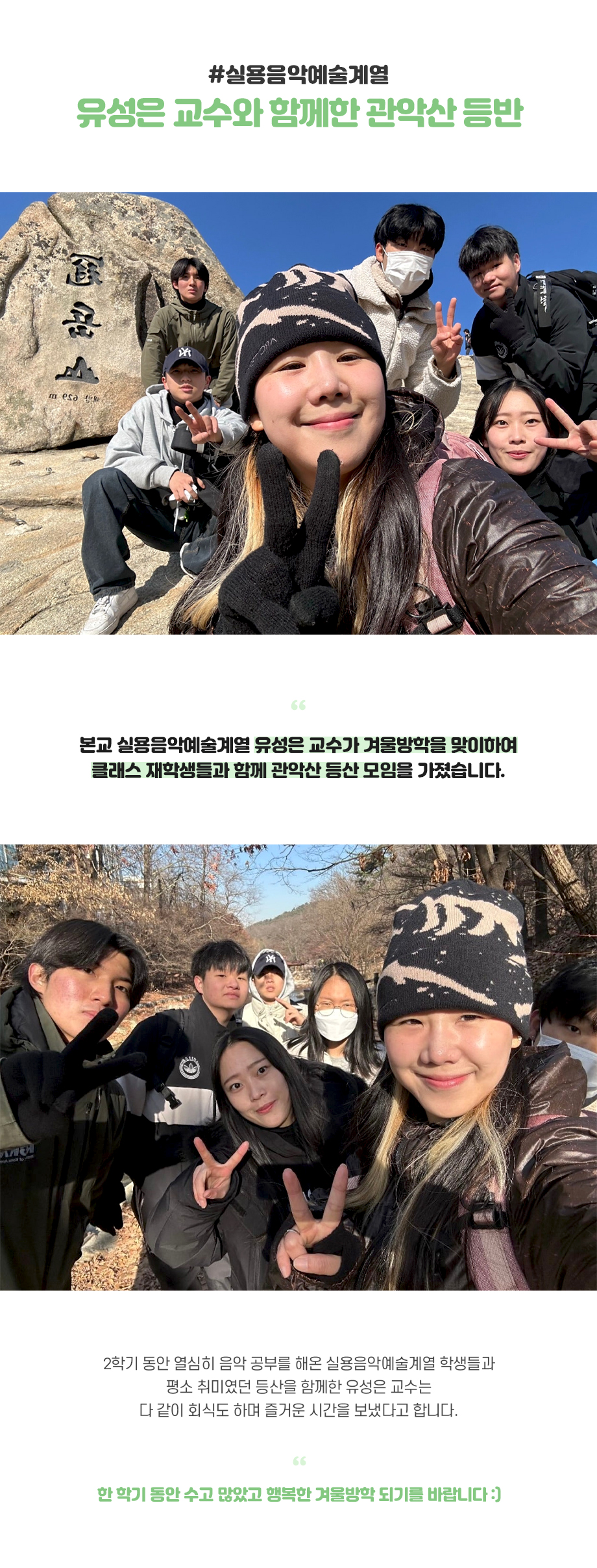 겨울방학을 맞이하여 실용음악예술계열 유성은 교수가 클래스 재학생들과 함께 관악산 등산 모임을 가졌습니다. 2학기 동안 열심히 음악 공부를 해온 실용음악예술계열 학생들과 평소 취미였던 등산을 함께한 유성은 교수는 다 같이 회식도 하며 즐거운 시간을 보냈다고 합니다.