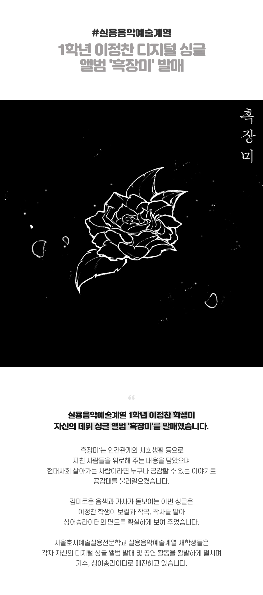 실용음악예술계열 1학년 이정찬 학생이 자신의 데뷔 싱글 앨범 '흑장미'를 발매했습니다. '흑장미'는 인간관계와 사회생활 등으로 지친 사람들을 위로해 주는 내용을 담았으며 현대사회 살아가는 사람이라면 누구나 공감할 수 있는 이야기로 공감대를 불러일으켰습니다.