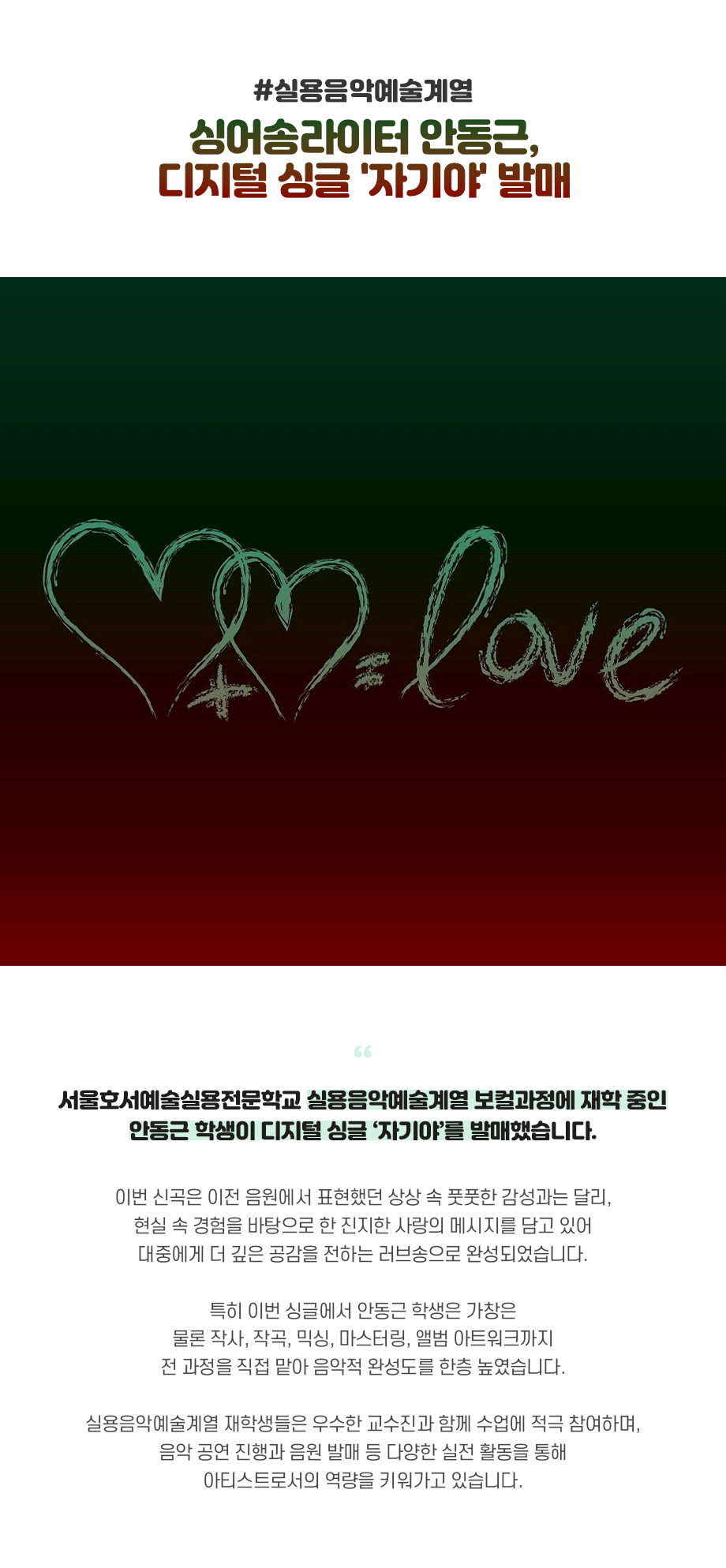 서울호서예술실용전문학교 실용음악예술계열 보컬과정에 재학 중인 안동근 학생이 디지털 싱글 ‘자기야’를 발매했습니다. 이번 신곡은 이전 음원에서 표현했던 상상 속 풋풋한 감성과는 달리, 현실 속 경험을 바탕으로 한 진지한 사랑의 메시지를 담고 있어 대중에게 더 깊은 공감을 전하는 러브송으로 완성되었습니다.