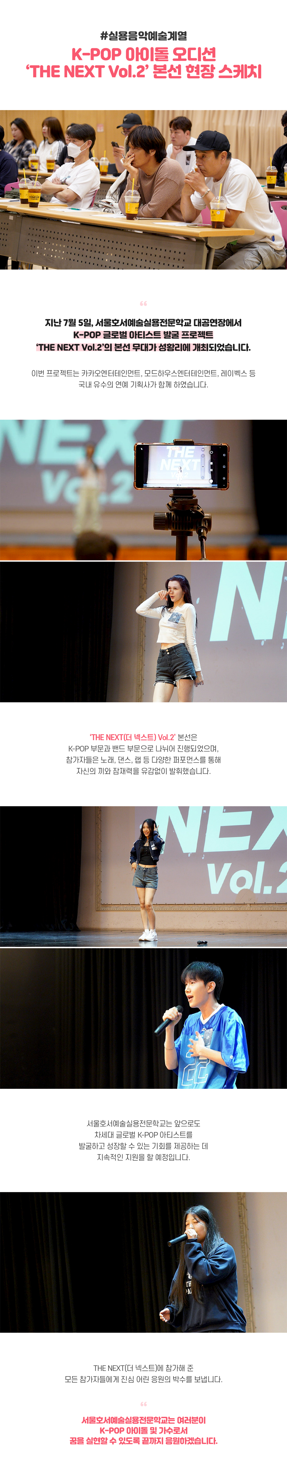 지난 7월 5일, 서울호서예술실용전문학교 예술관 6층 대공연장에서 K-POP 글로벌 아티스트 발굴 프로젝트 ‘THE NEXT Vol.2’의 본선 무대가 성황리에 개최되었습니다. 이번 프로젝트는 카카오엔터테인먼트, 모드하우스엔터테인먼트, 레이벡스 등 국내 유수의 연예 기획사가 함께 하였습니다.