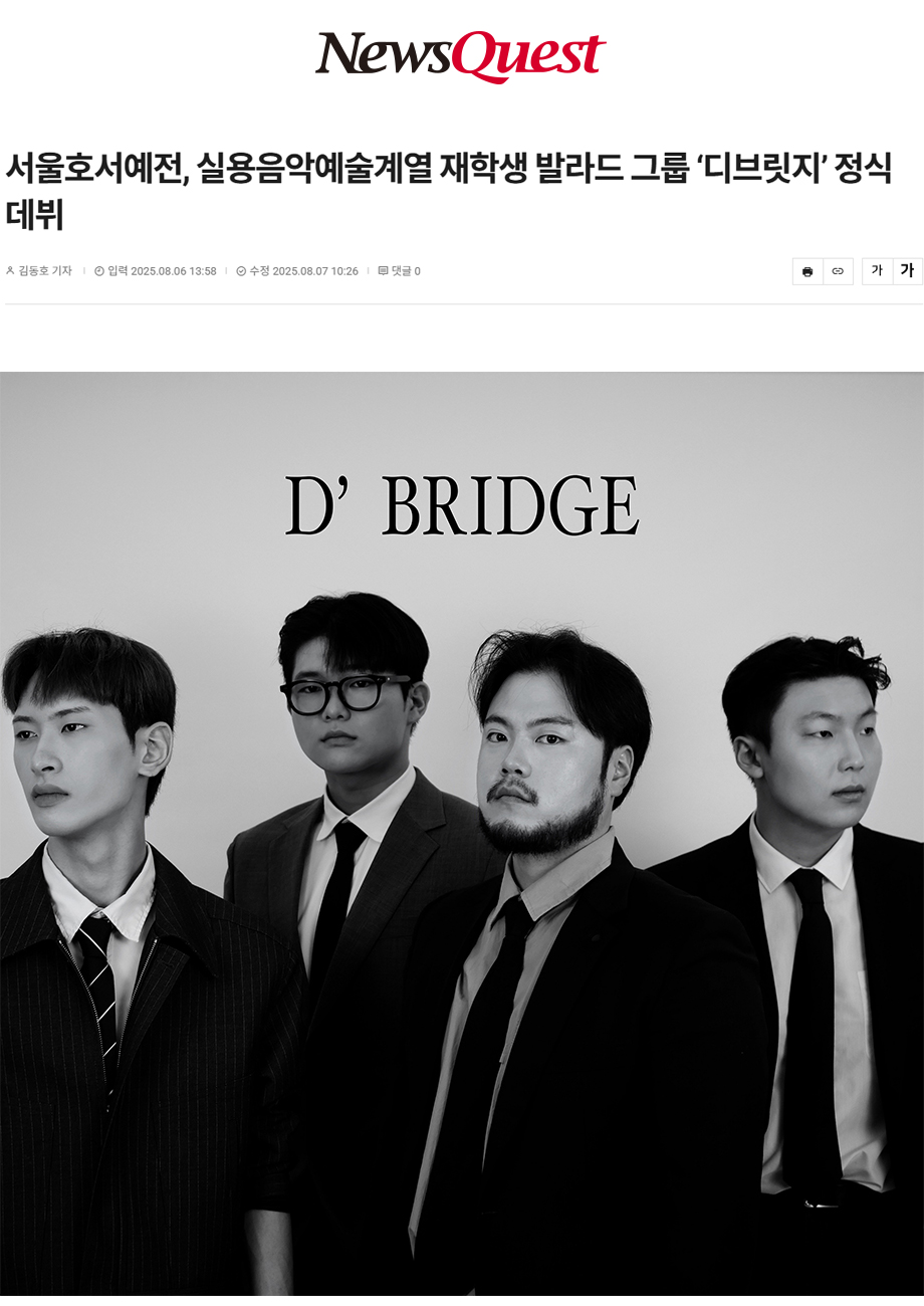 ‘D’BRIDGE(디브릿지)’는 서울호서예전 실용음악예술계열 1학년 주상민, 이예준 학생과 2학년 권수호, 정재훈 학생으로 구성된 4인조 신인 보컬그룹이다.