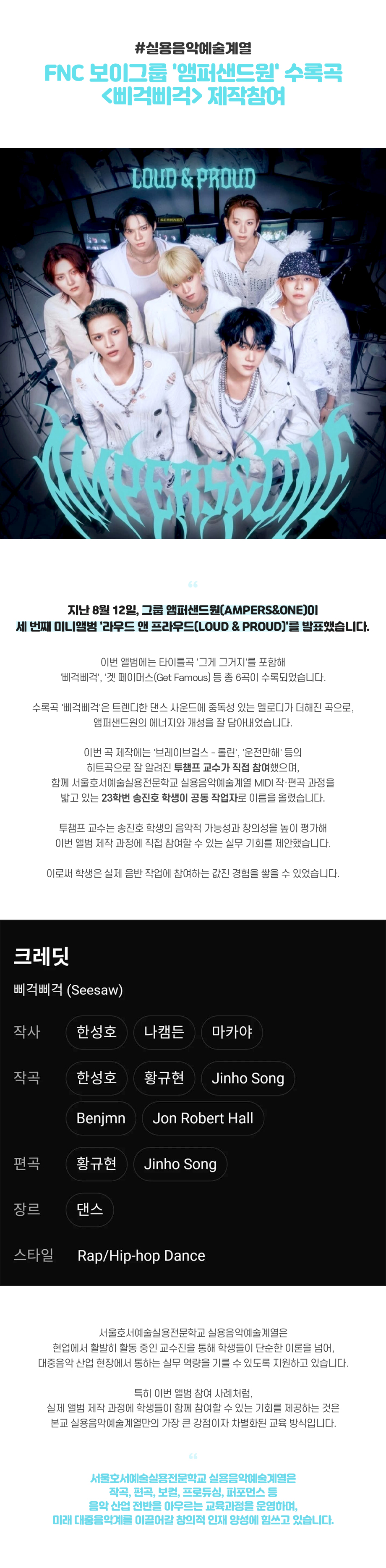 실용음악예술계열 FNC 보이그룹 '앰퍼샌드원' 수록곡 <삐걱삐걱> 제작참여