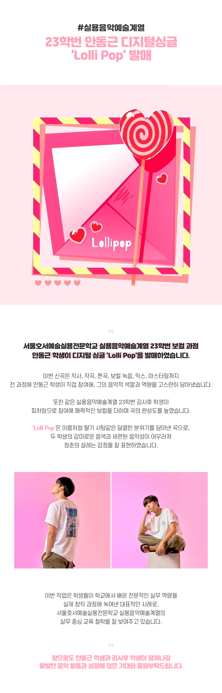 서울호서예술실용전문학교 실용음악예술계열 23학번 보컬 과정 안동근 학생이 디지털 싱글 'Lolli Pop'을 발매하였습니다. 이번 신곡은 작사, 작곡, 편곡, 보컬 녹음, 믹스, 마스터링까지 전 과정에 안동근 학생이 직접 참여해, 그의 음악적 색깔과 역량을 고스란히 담아냈습니다.