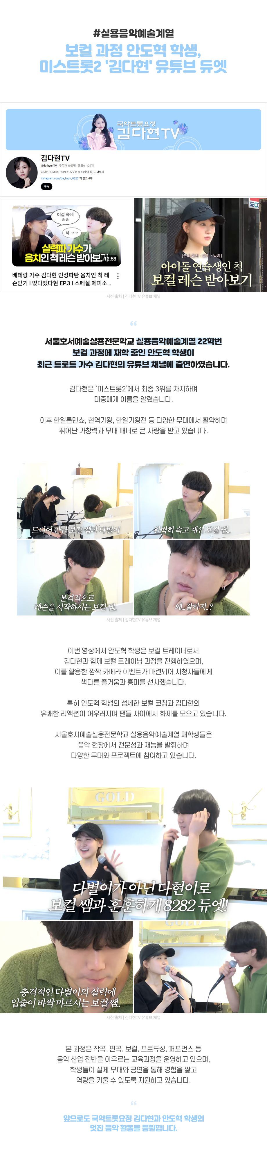 실용음악예술계열 안도혁 학생, 미스트롯2 '김다현' 유튜브 듀엣