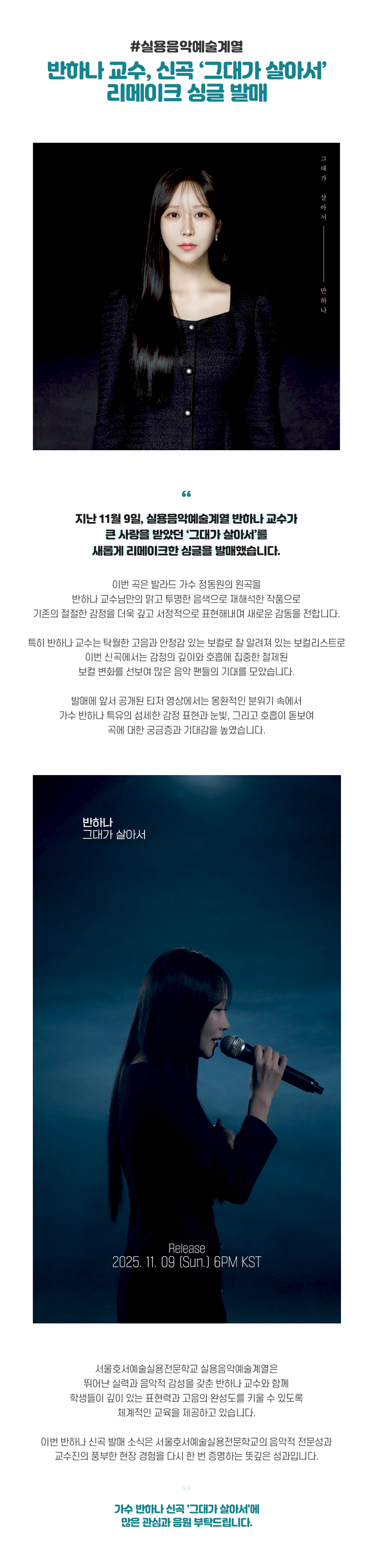 실용음악예술계열 반하나 교수가 지난 11월 9일, 큰 사랑을 받았던 ‘그대가 살아서’를 새롭게 리메이크한 싱글을 발매했습니다.