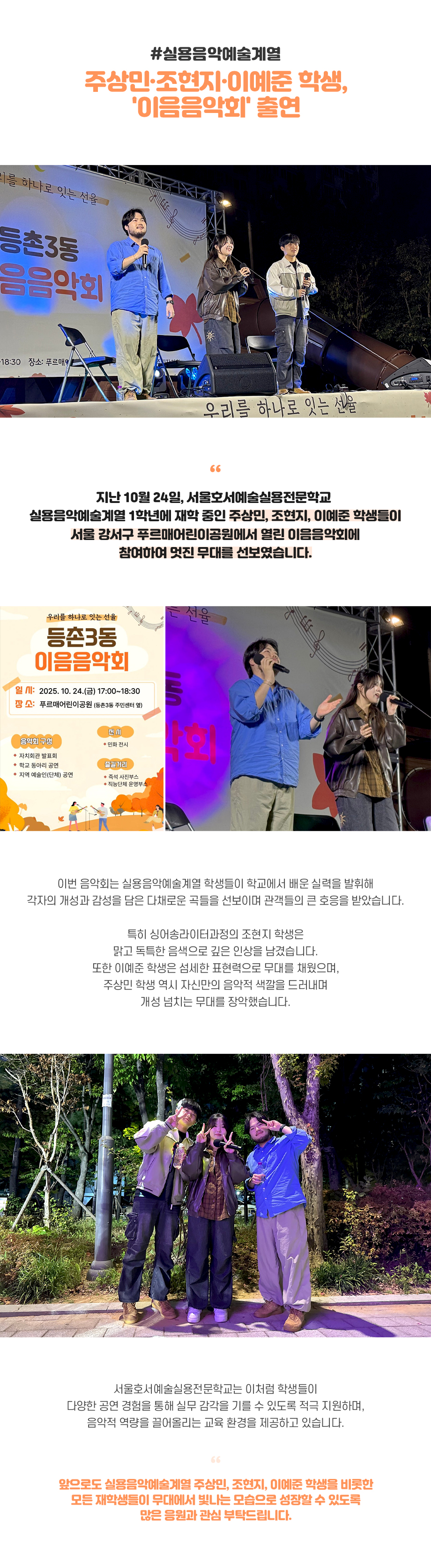 지난 10월 24일, 서울호서예술실용전문학교 실용음악예술계열 1학년에 재학 중인 주상민, 조현지, 이예준 학생들이 서울 강서구 푸르매어린이공원에서 열린 이음음악회에 참여하여 멋진 무대를 선보였습니다.
