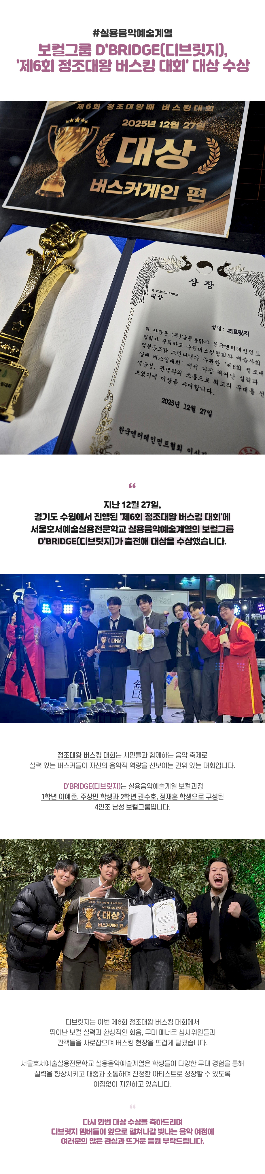 지난 12월 27일, 경기도 수원에서 진행된 '제6회 정조대왕 버스킹 대회'에 서울호서예술실용전문학교 실용음악예술계열의 보컬그룹 D'BRIDGE(디브릿지)가 출전해 대상을 수상했습니다.