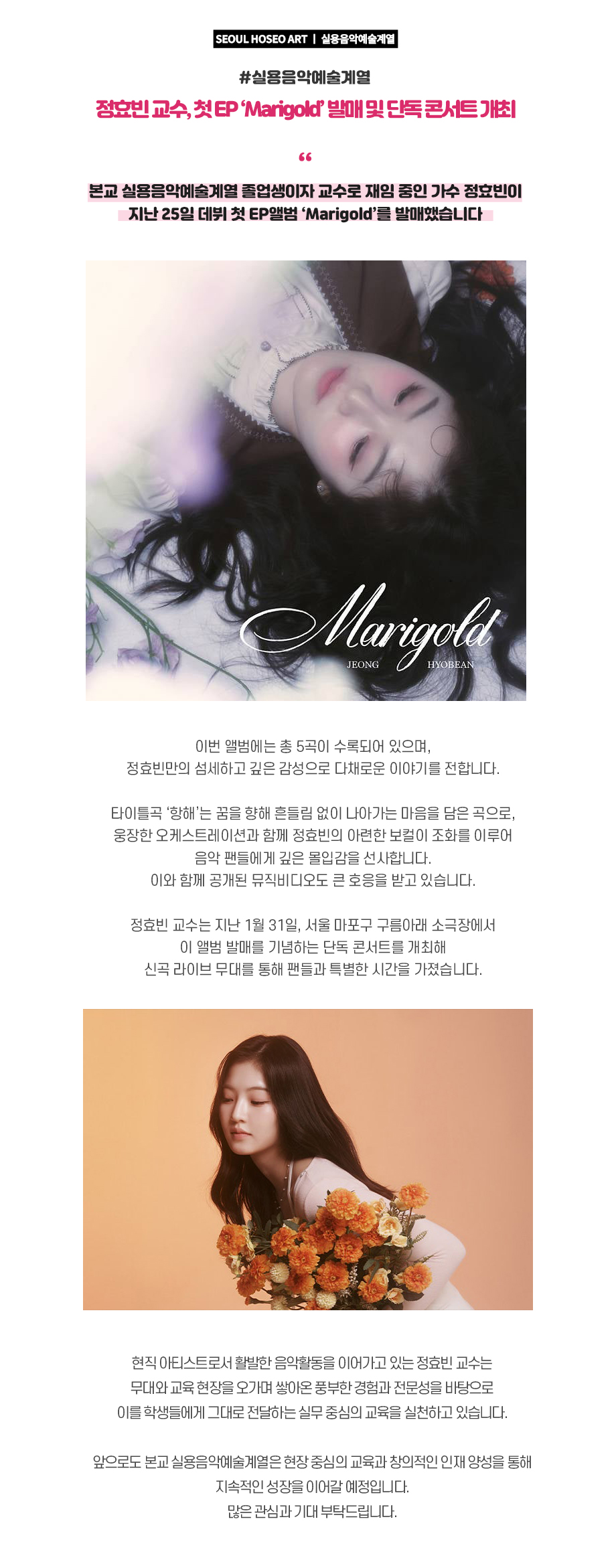 본교 실용음악예술계열 졸업생이자 교수로 재임 중인 가수 정효빈이 지난 25일 데뷔 첫 EP앨범 ‘Marigold’를 발매했습니다.