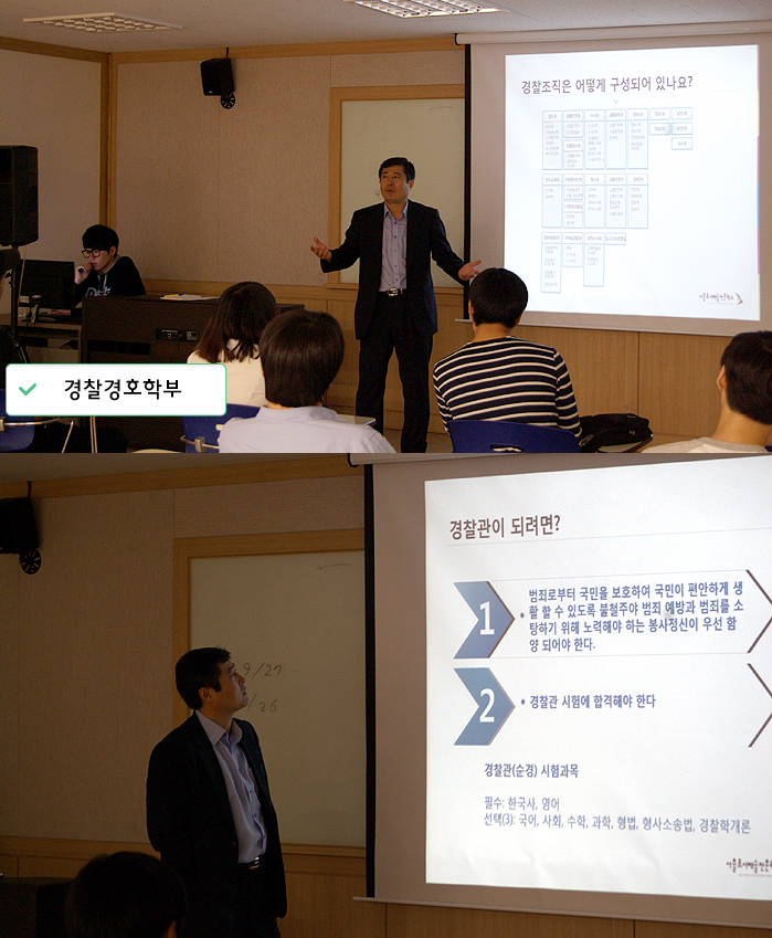 경찰경호학부 학생들의 커리큘럼을 토대로 경찰시험에 대한 준비 및 대비방법에 대해서 자세히 배울 수 있는 시간이었습니다.