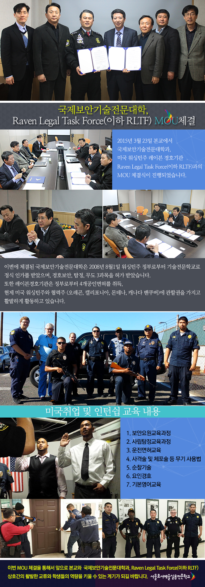 2015년 3월 23일 본교에서 국제보안기술전문대학과, 미국 워싱턴주 레이븐 경호기관과의 MOU 체결식이 진행되었습니다.