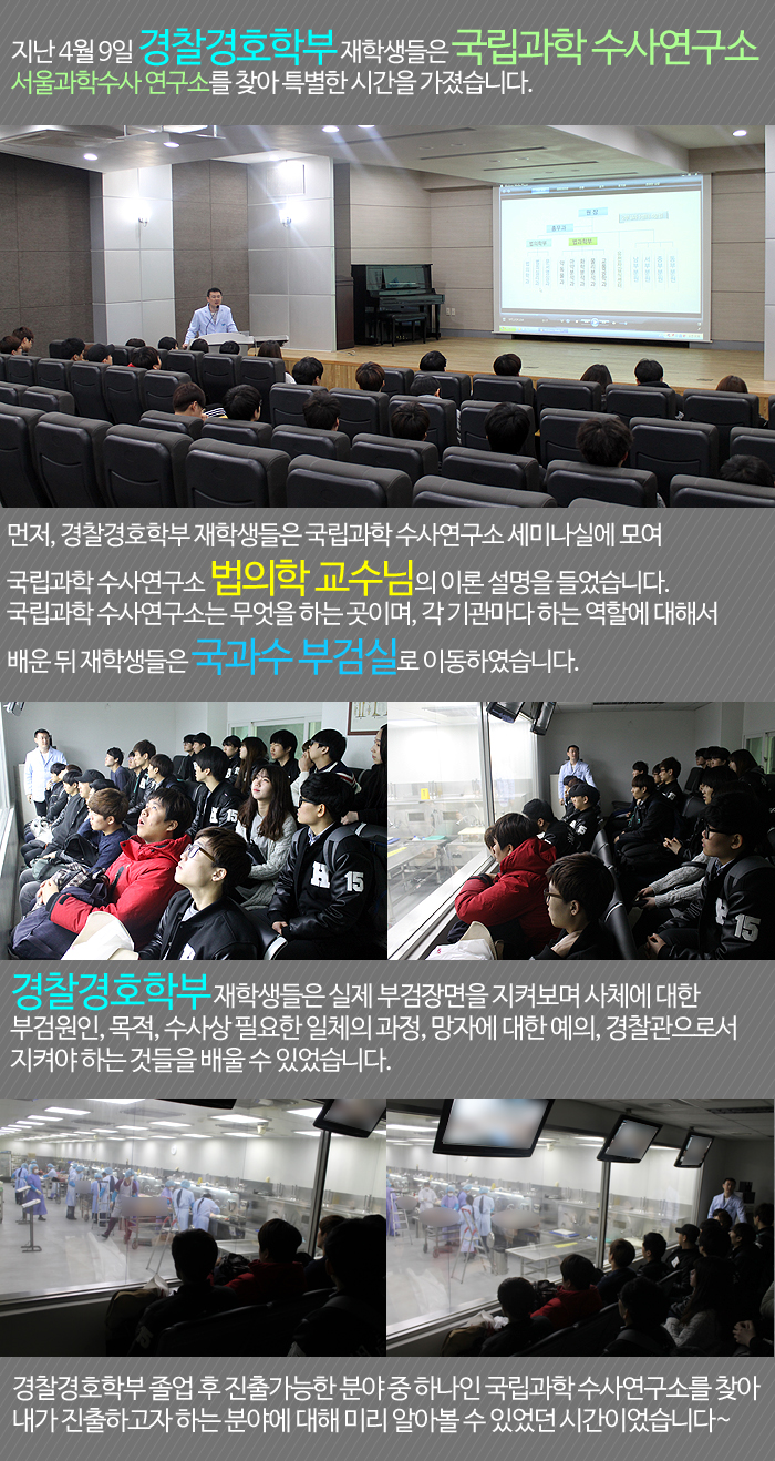 경찰경호학부 재학생들은 김균태 교수와 함께 국립과학 수사연구소 서울과학수사 연구소를 찾아 과학수사에 대한 이론지식과 함께 국가수 부검실을 찾아 현직 연구원들의 업무를 견학하는 시간을 가지며 부검을 하는 이유, 망자에 대한 예의를 배우는 시간을 가졌습니다.