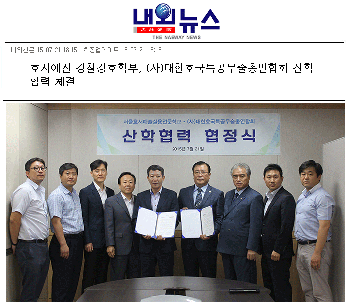 [내외신문=김영현 기자]서울호서예술실용전문학교 경찰경호계열은 (사)대한호국특공무술총연합회와 21일 서울호서예술실용전문학교에서 상호협력과 장기적인 협력체계를 구축하는 내용의 산학협력을 체결했다.