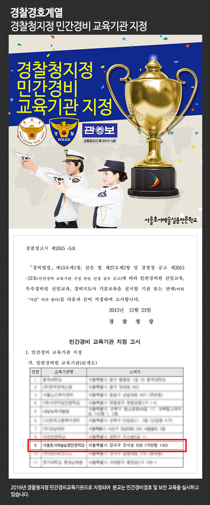 2016년 경찰청지정 민간경비교육기관으로 지정되어 본교는 민간경비경호 및 보안 교육을 실시하고 있습니다.