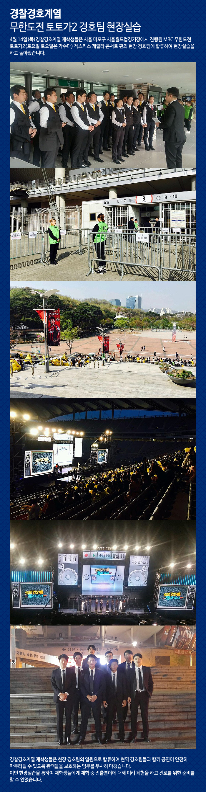 4월 14일(목)경찰경호계열 재학생들은 서울 마포구 서울월드컵경기장에서 진행된 MBC 무한도전 토토가2(토요일 토요일은 가수다) 젝스키스 게릴라 콘서트 편의 현장 경호팀에 합류하여 현장실습을 하고 돌아왔습니다.