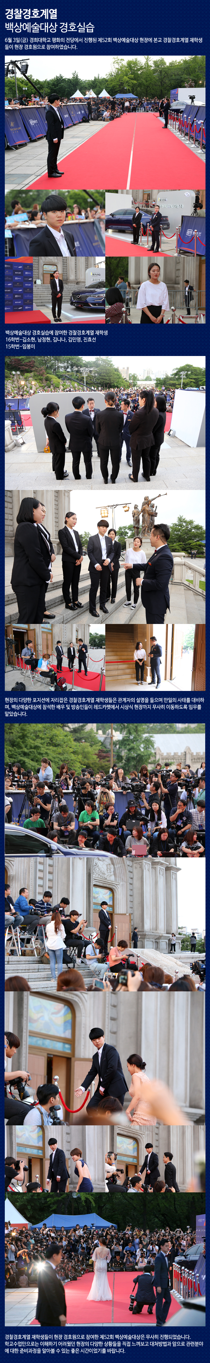 6월 3일(금) 경희대학교 평화의 전당에서 진행된 제52회 백상예술대상 현장에 본교 경찰경호계열 재학생들이 현장 경호원으로 참여하였습니다.