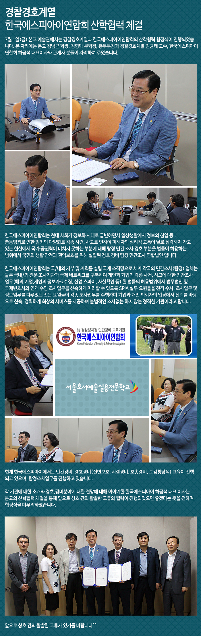 7월 1일(금) 본교 예술관에서는 경찰경호계열과 한국에스피아이연합회의 산학협력 협정식이 진행되었습니다.