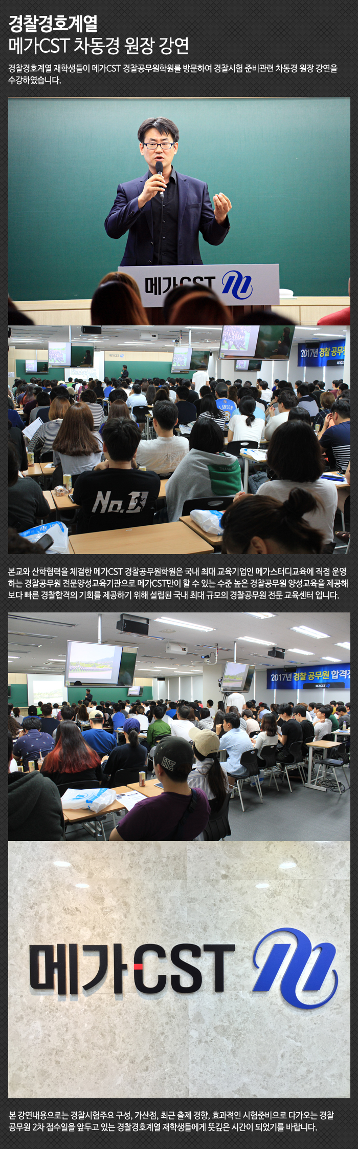 경찰경호계열 재학생들이 메가CST 경찰공무원학원를 방문하여 경찰시험 준비관련 차동경 원장 강연을 수강하였습니다.