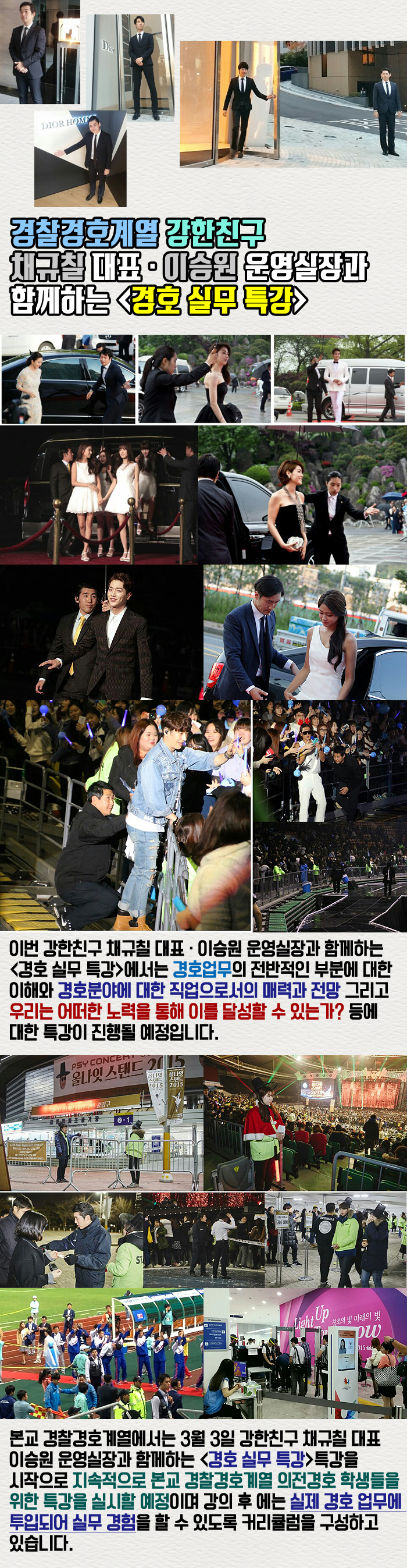 이번 강한친구 채규칠 대표 · 이승원 운영실장과 함께하는 '경호 실무 특강'에서는 경호업무의 전반을 설명하고 경호분야에 대한 직업으로서의 매력과 전망 그리고 우리는 어떠한 노력을 통해 이를 달성할 수 있는가? 등에 대한 특강이 진행될 예정입니다.