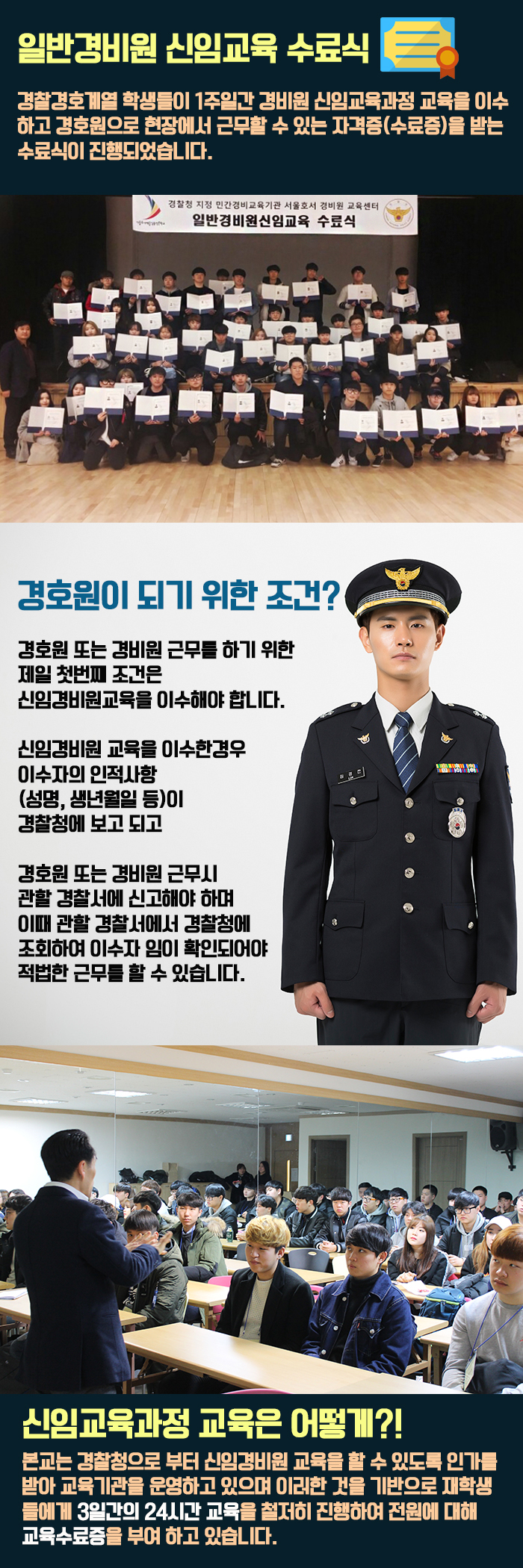 경찰경호계열 학생들이 1주일간 경비원 신임교육과정 교육을 이수하고, 경호원으로 현장에서 근무할 수 있는 자격증(수료증)을 받는 수료식이 진행되었습니다.