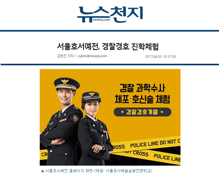 [천지일보=김현진 기자] 고3수험생들을 위한 경찰경호 진학체험이 오는 24일 오전 10시 서울 강서구 가양동 소재 서울호서예술실용전문학교(서울호서예전)에서 개최된다.