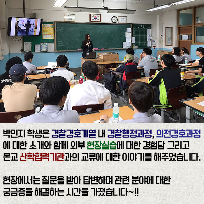 경찰경호계열 박민지 학생이 고등학교를 방문하여 강연을 하고 왔습니다.