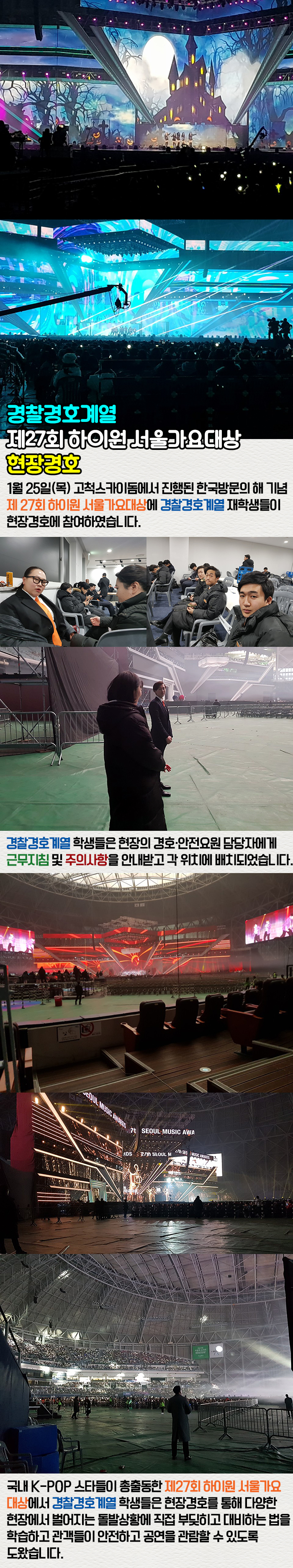1월 25일(목) 고척스카이돔에서 진행된 한국방문의 해 기념 제 27회 하이원 서울가요대상에 경찰경호계열 재학생들이 현장경호에 참여하였습니다.