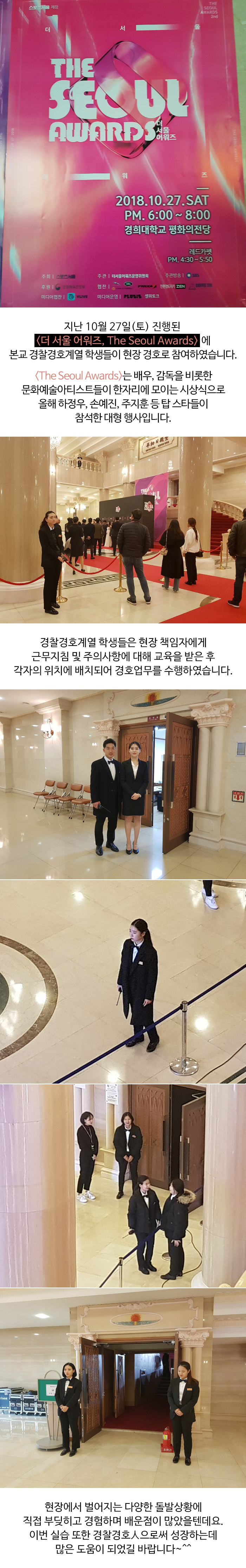 지난 10/27(토) 진행된 <더 서울 어워즈, The Seoul Awards>에 본교 경찰경호계열 학생들이 현장 경호로 참여하였습니다.