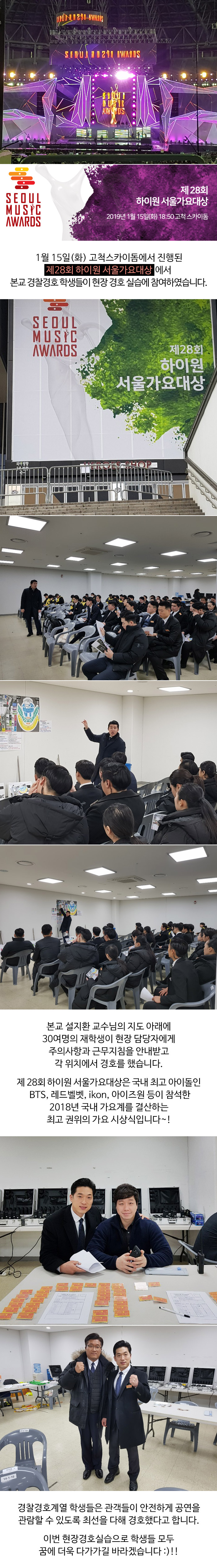 1월 15일(화) 고척스카이돔에서 진행된 제28회 하이원 서울가요대상에서 본교 경찰경호계열 학생들이 현장 경호 실습에 참여했습니다.