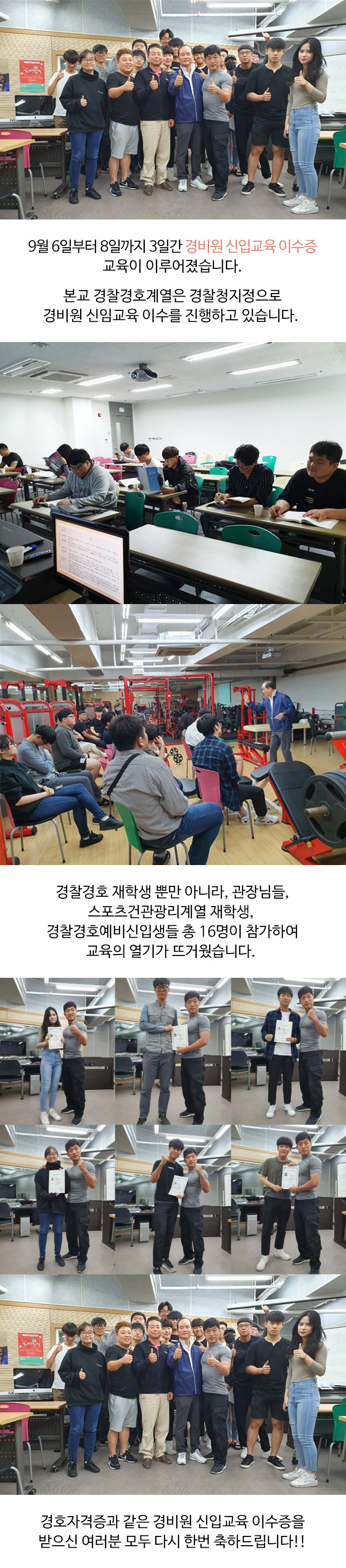 본교 경찰경호계열은 경찰청지정으로 경비원 신임교육 이수를 진행하고 있습니다.