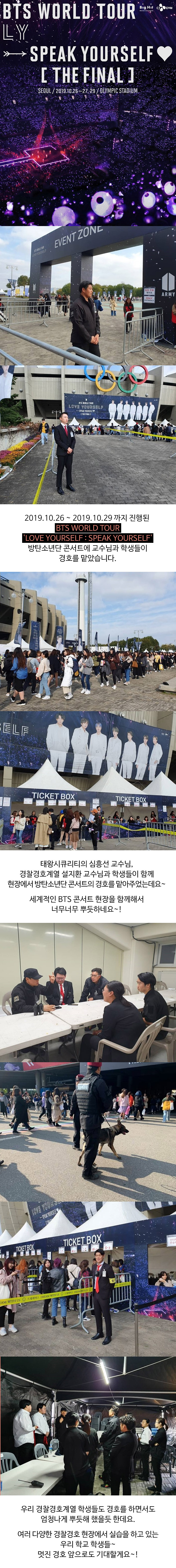 2019.10.26 ~ 2019.10.29 까지 진행된 BTS WORLD TOUR 'LOVE YOURSELF : SPEAK YOURSELF' 방탄소년단 콘서트에 교수님과 학생들이 경호를 맡았습니다.
