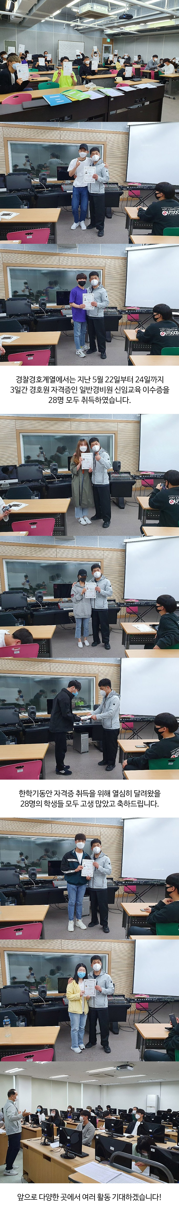 경찰경호계열에서는 지난 5월 22일부터 24일까지 3일간 경호원 자격증인 일반경비원 신임교육 이수증을 28명 모두 취득하였습니다.